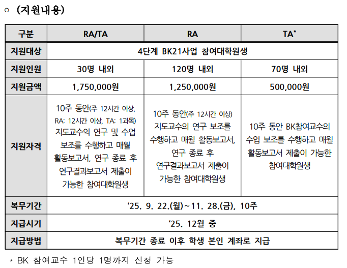 스마트로봇융합응용교육연구단에서 「2025-2학기 RA/TA 신청」 안내드립니다. 학생분들께서는 기한 내 서류 제출하여 주시기 바랍니다. · 제 출 처 : 학과사무실(가온관 501호) · 제출기한 : ~9/10(수), 오후2시까지 · 제출서류 : 원본제출 ①. [붙임1-제1호 서식] 지원서 1부. ②. [붙임1-제2호 서식] 복무협약서 1부. ③. [붙임1-제3호 서식] 활동계획서 1부. ④. 통장사본 1부. ★ (필독) 2025-2학기 RA/TA 운영 관련 변경사항 0. 서식 변경사항 : 공휴일(추석연휴) 활동금지에 따라 [제2호 서식]복무협약서, [제4호 서식] 활동보고서, [제5호 서식] 연구결과보고서 내 기간 변경 1. 매월 활동보고서 - 학생이 직접 학사시스템에서 직접 입력 - 학생 개인 수업시간, (대학원혁신) RA/TA, (대학원행정실) 연구조교/수업조교 활동시간이 중첩되는 경우 시스템에서 활동시간 입력이 불가. - 주말, 공휴일 활동 일체 금지 - 활동 가능시간 : 평일 09:00~22:00 (점심시간 제외 12:00~13:00) 2. 활동연장 - 최대 2주까지(2025.12.19.) 가능하며, 활동 연장자 발생하는 경우 장학금 지급 12월→1월로 연기 ※ 학생 개인사정으로 복무기간 내 연구·수업조교 활동이 어려울 경우, 장학금 지급이 불가하오니 이 점 양지하여 신청 바랍니다. 가. 신청대상 : 4단계 BK21사업 참여대학원생 ※ 수료후 연구생 제외