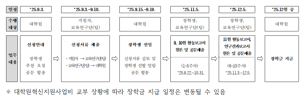 나. 신청방법 : 소속 교육연구단(팀)으로 신청서류 원본 제출 - (선정방법) 지원자의 자격요건을 면밀히 검토 후 예산범위 내에서 선정 다. 운영일정 ※ 주말, 공휴일 활동금지에 따라 복무기간 변경(2025.09.03.자 변경) · 복무기간 : 2025.09.22.(월) ~ 11.28.(금) → 12.05.(금)